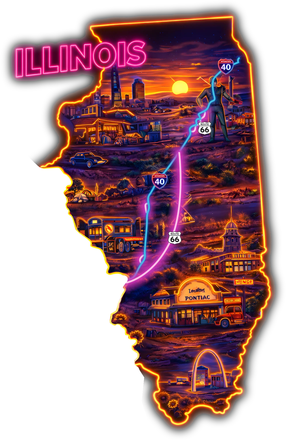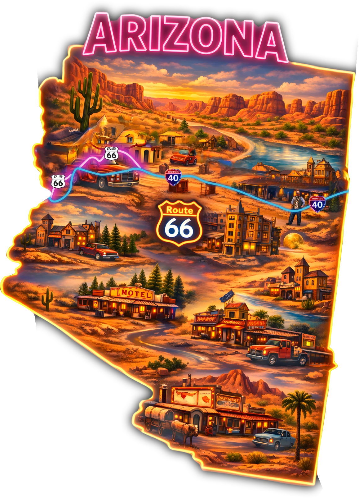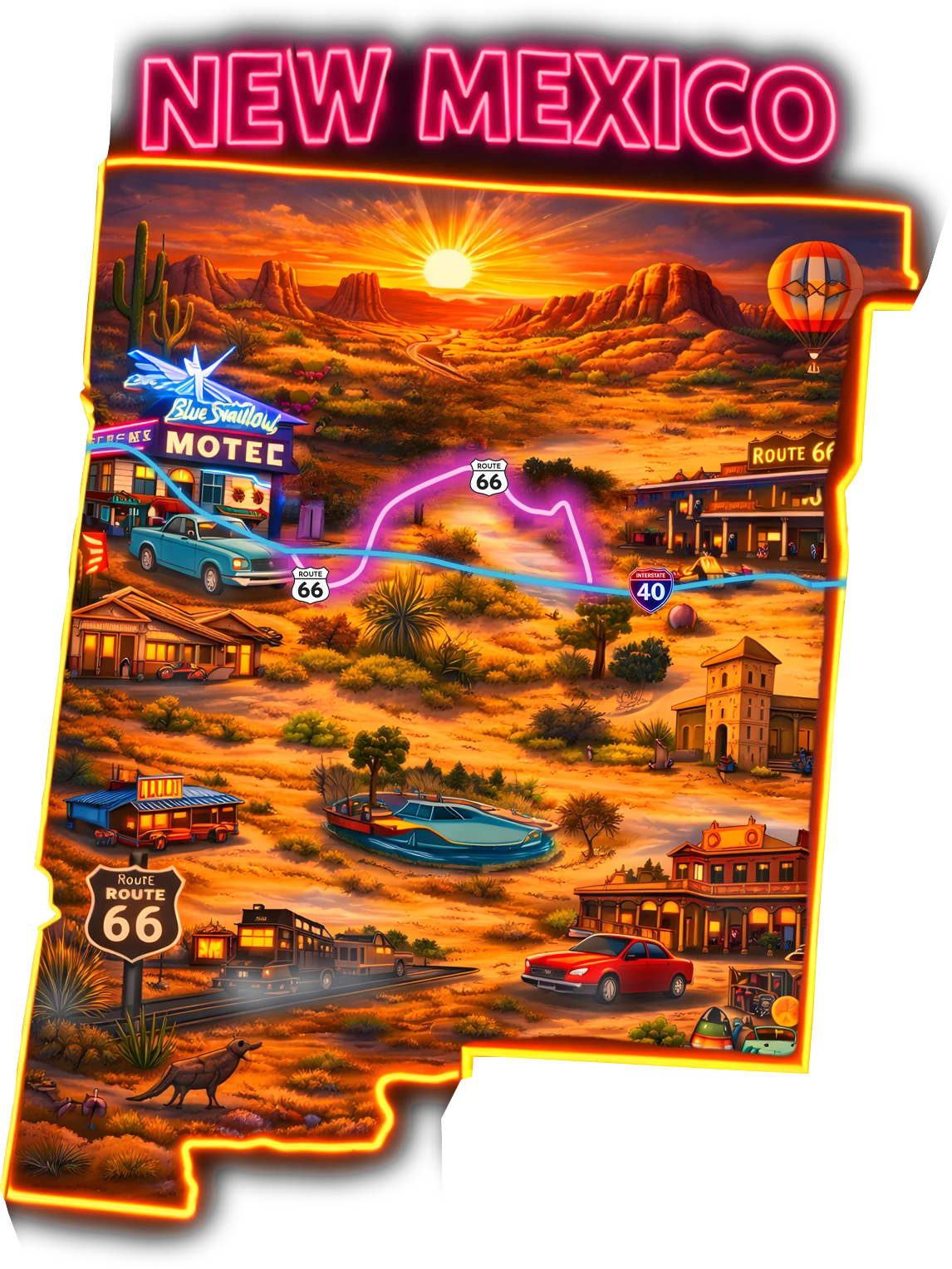 Click any state on the map to explore its Route 66 heritage — iconic landmarks, classic diners, charming towns and must-see stops along the Mother Road.